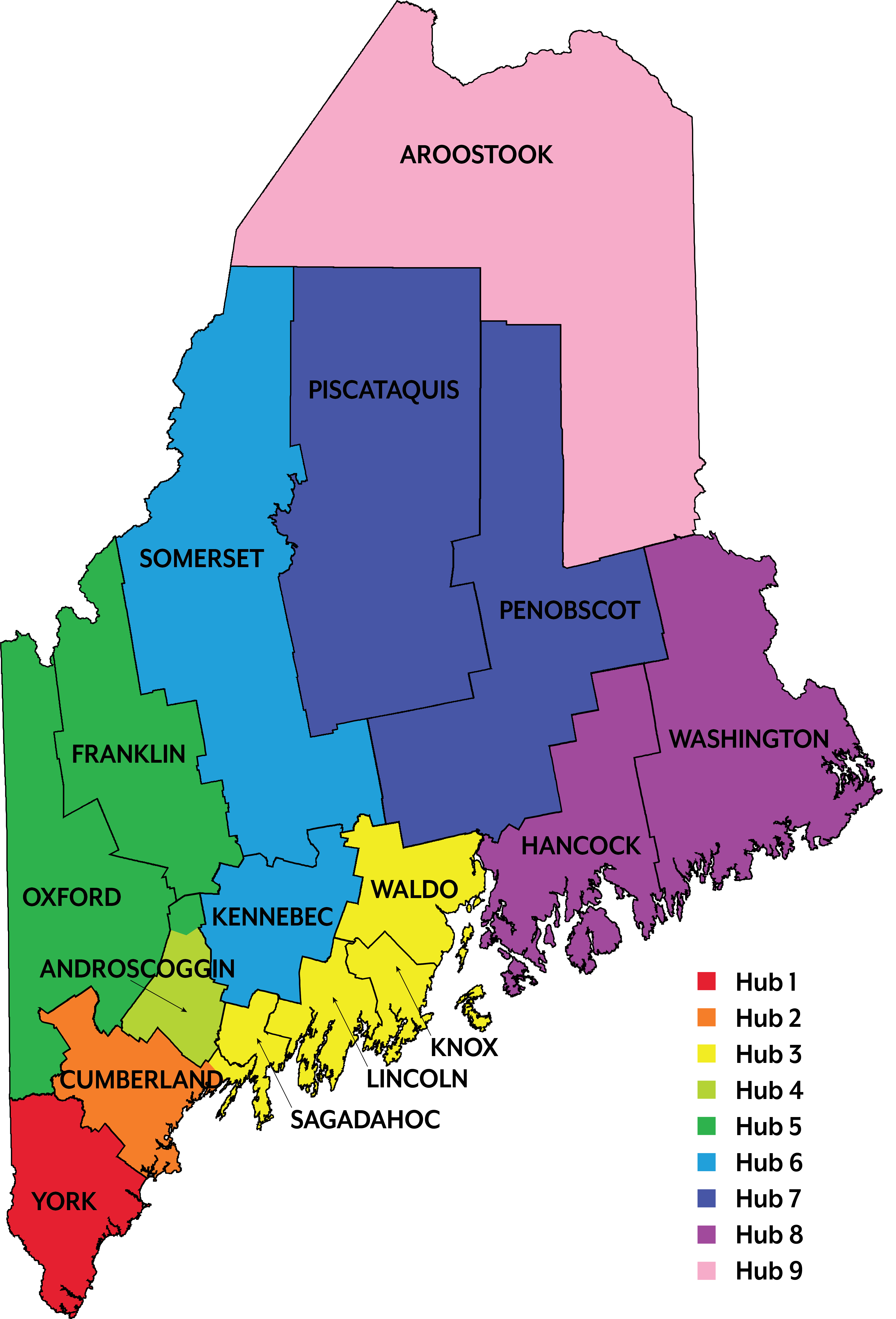 | Hub 3: | Midcoast: Sagadahoc, Knox, Lincoln, Waldo counties and Towns of Brunswick and Harpswell |